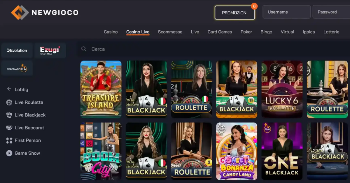 Il Newgioco casino Italia ha una vasta gamma di giochi, tra cui centinaia di slot machine, classici giochi da tavolo come Roulette e Blackjack, nonché una sezione live con croupier reali.